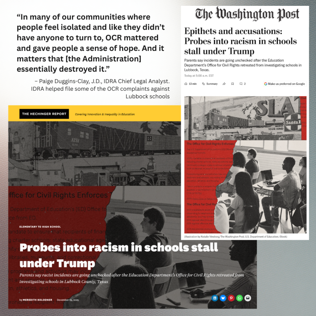 IDRA has been supporting families and the Lubbock NAACP in Lubbock, Texas, since at least 2023 regarding persistent harassment and bullying against Black students in two districts. We helped some of the families file OCR complaints, which are now stuck due to the cuts at the U.S. Department of Education.